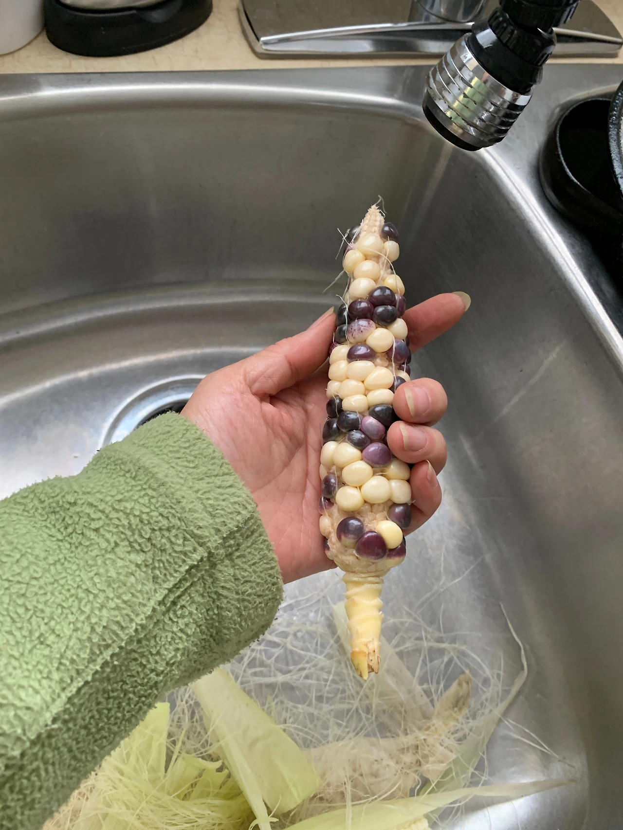 껍질째 먹는 콩은 이미 너무 익어버려서, 깍지를 벌려 콩을 수확해서 말리기로 했고, 조그맣게 붙어있던 옥수수도 따 먹었다.