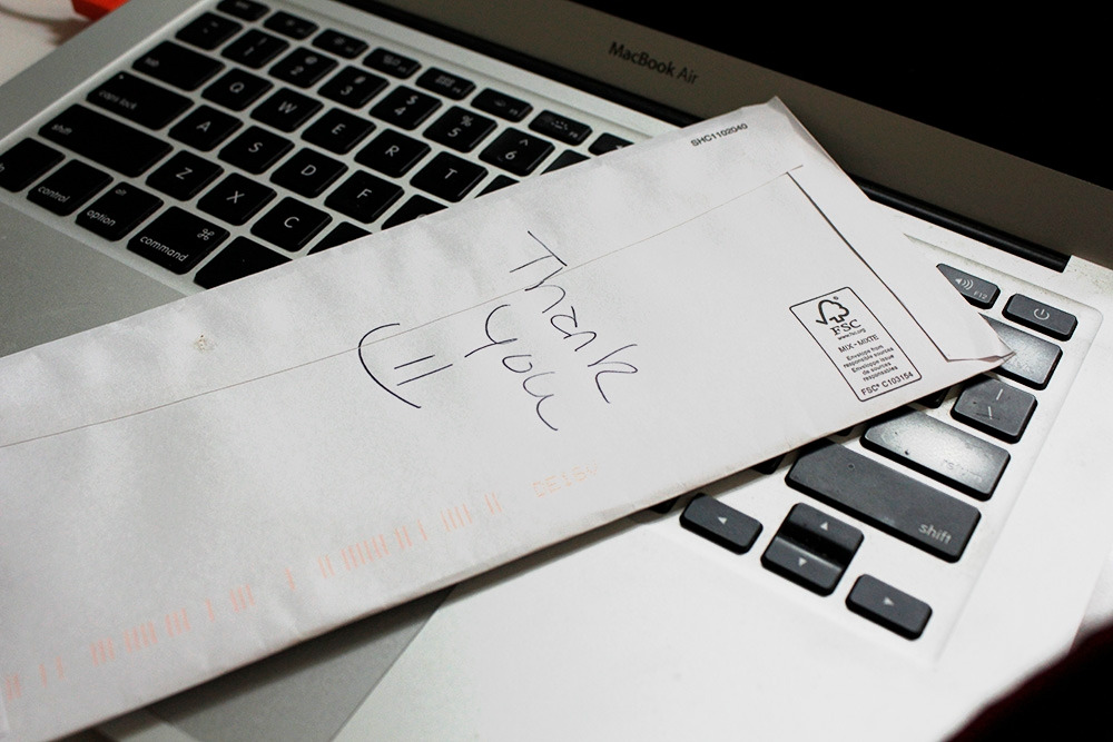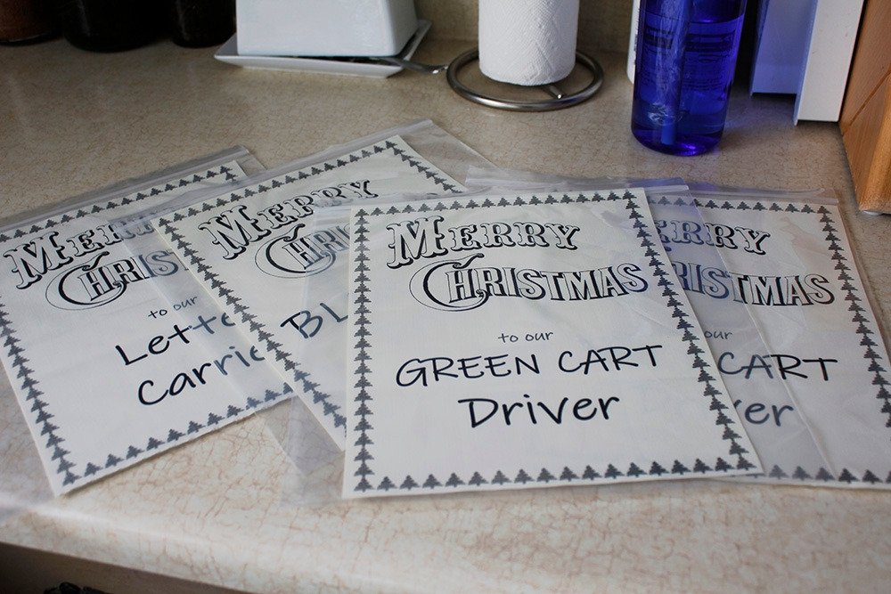 시간 맞춰 나가서 인사하고 주는 것은 엄청 번거로운 일이니, 이렇게 큰 지퍼백에 기프트카드를 담아서 쓰레기통 앞에 미리 붙여 놓는다. 그들은 수거해가면서 경적을 두 번 울려서 감사를 표하기도 하고, 우편물에 스마일 표시를 넣어서 마음을 전하기도 한다.