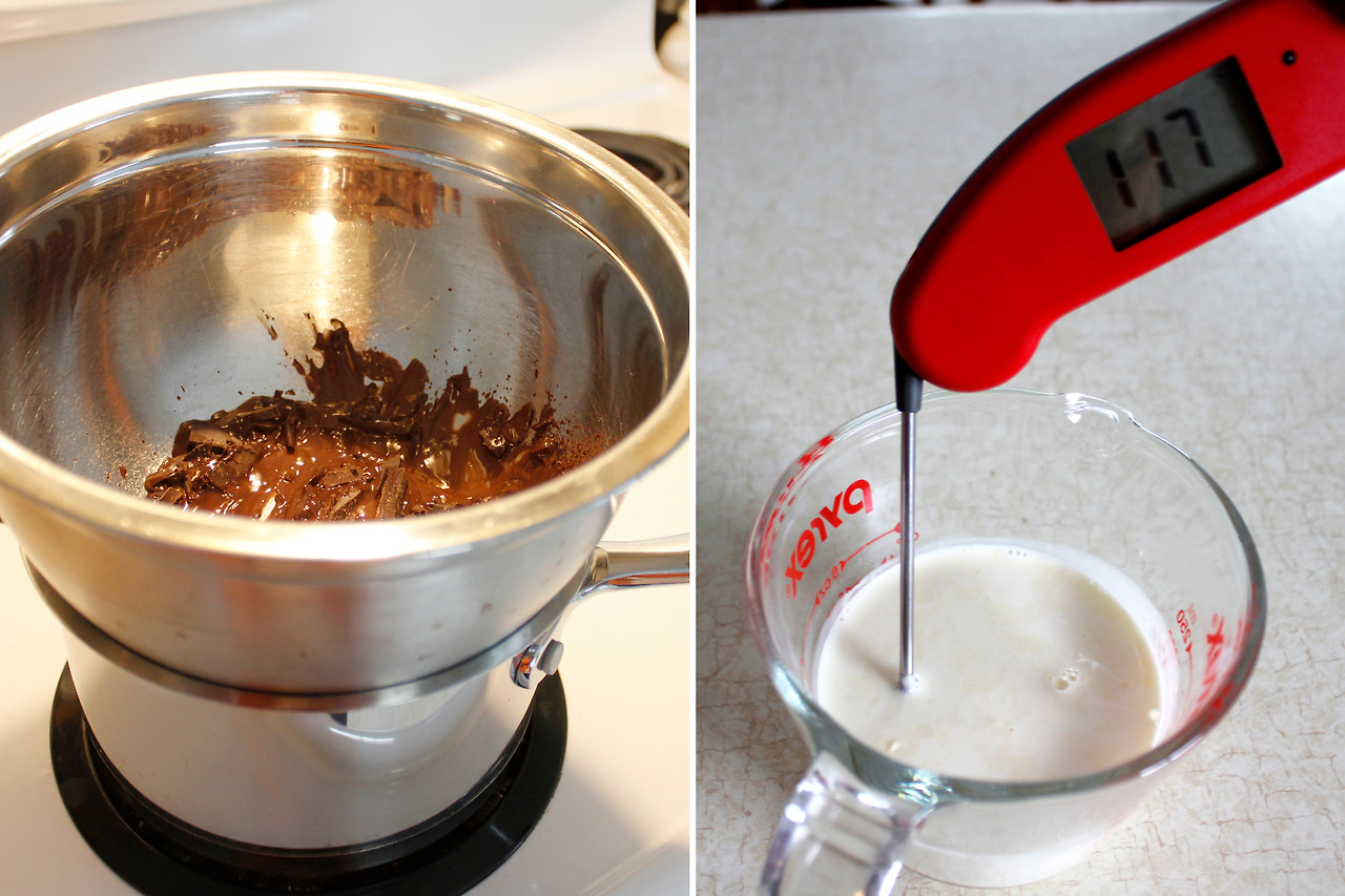 초콜릿은 생크림 양의 반 정도 되는 무게로 준비하여 잘게 다져준 후 중탕을 한다. 중탕을 할 때에는 인내심을 갖고 천천히 녹인다고 생각하는 것이 좋다. 중탕냄비의 물도 팔팔 끓이지 말고, 뭉근하게 끓이는 것이 좋다. 이때 초콜릿에 물이 들어가지 않게 조심하자.