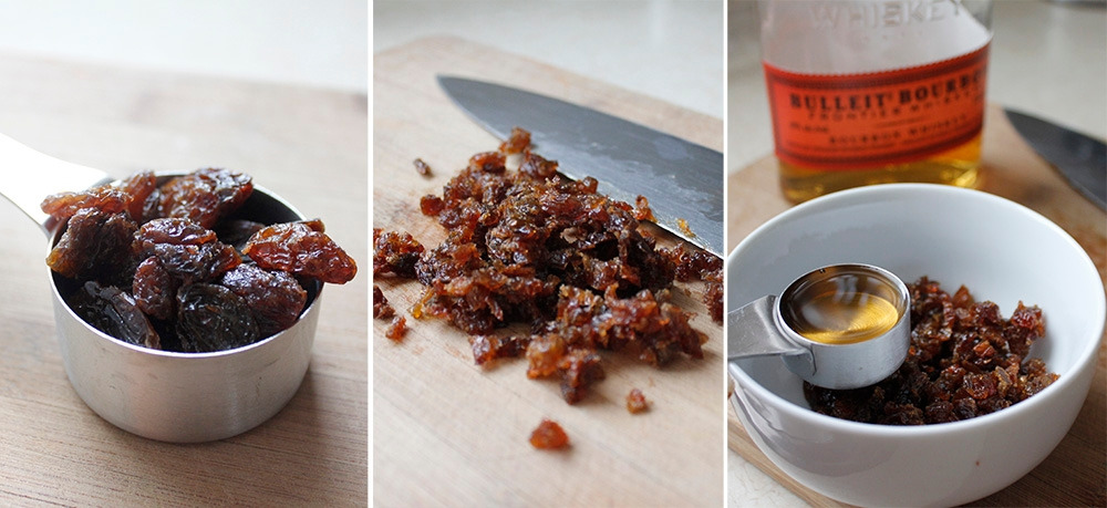 우선, 건포도를 준비했다. 얼마나 넣을까를 생각하다가, 맛있기는 해도 나는 건더기가 많이 씹히는 초콜릿은 좋아하지 않기 때문에 1/4컵만 넣기로 했다. 꾹꾹 채워서 준비했다. 그리고 잘게 다진 후 거기에 버본을 한 숟가락 부어서 촉촉하게 적셔줬다. 아무래도 따로 나중에 섞으면 버본이 겉돌 수 있기 때문이었다.