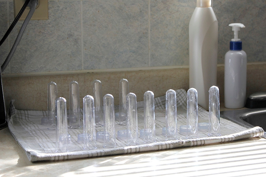 꽃의 아래쪽에 물을 보관하는 작은 통이 달려서 오는데, 그게 어디 꽃 선물할 때 활용하기도 좋고 해서 모으고 싶게 생긴 것이다. 남편은 잡동사니 모으는 거 딱 질색하는 사람인데, 뻔히 내가 좋아할 줄 알고, 그걸 헹궈서 나란히 엎어 놓은 것이다! 난 이럴 때 그의 마음이 전해져서 가슴속이 간질간질 해지고 기분이 좋다.