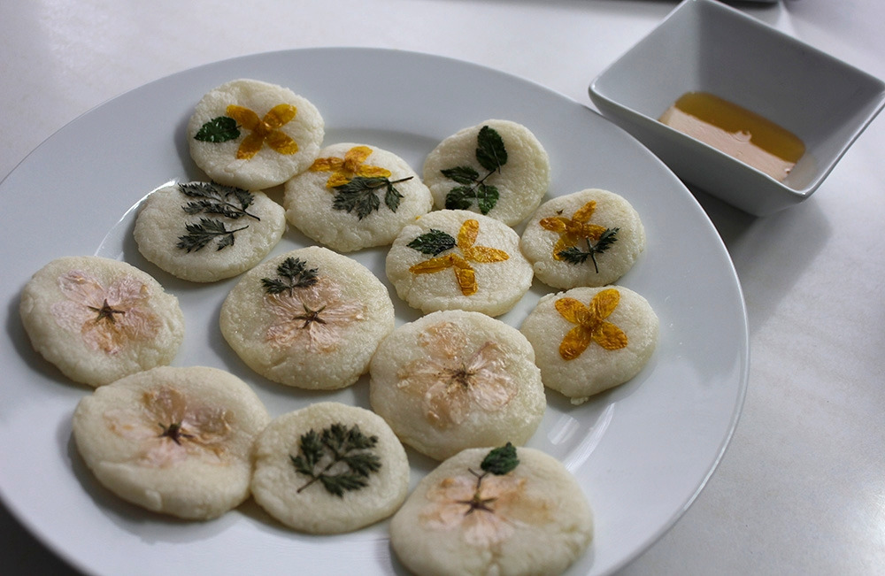 이제 프라이팬을 중불로 달구고, 화전 반죽을 하나씩 얹었다. 한쪽 면이 살짝 익을 때까지 잠시 두었다가 뒤집어서는 준비된 꽃들을 붙였다. 잘 붙지 않는 듯하였으나 잠시 누르고 있으면 얌전히 숨이 죽으며 달라붙었다. 다만 벚꽃은 색이 연해서 그 고운 빛이 별로 티가 나지 않았다.