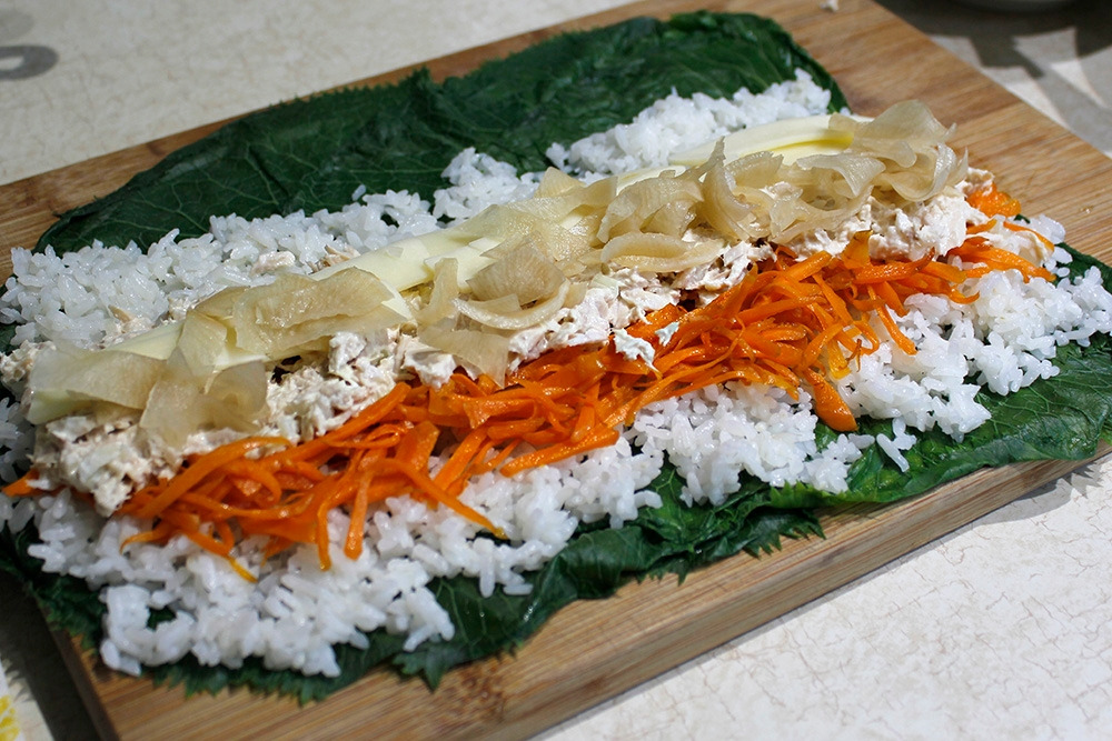 9. 김발에 곰취를 잘 펼치고, 밥을 깔은 후 속재료를 넣고 단단히 말아준다.