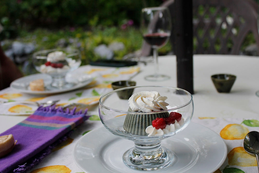 꺼낸 모양이 예쁘기 때문에 그대로 서빙해도 되지만, 손님 초대 시에는 거기에 장식을 얹으면 날개를 단다. 나는 생크림을 휘핑해서 올리기도 하는데, 그러면 아이스크림이 더 부드럽게 느껴진다. 이렇게 초록 아이스크림에는 빨간 산딸기가 잘 어울린다. 마당에서 얼른 따서 얹었다.
