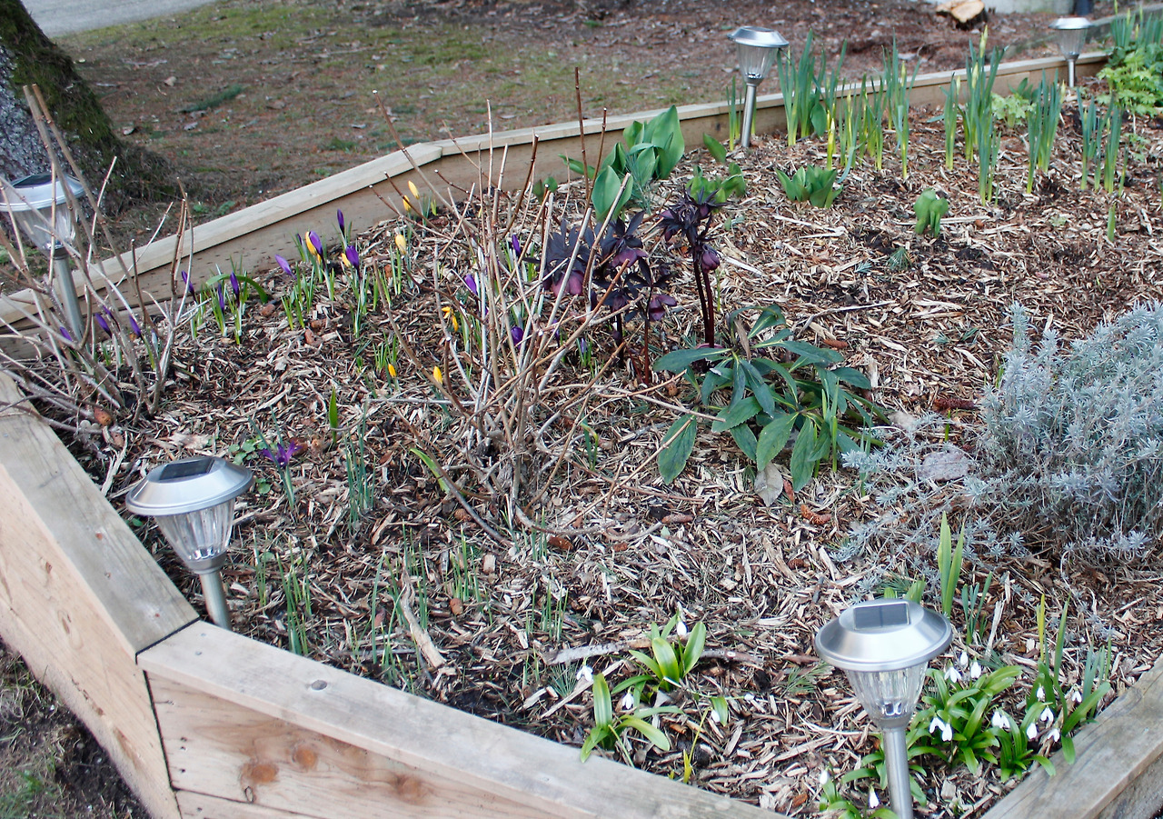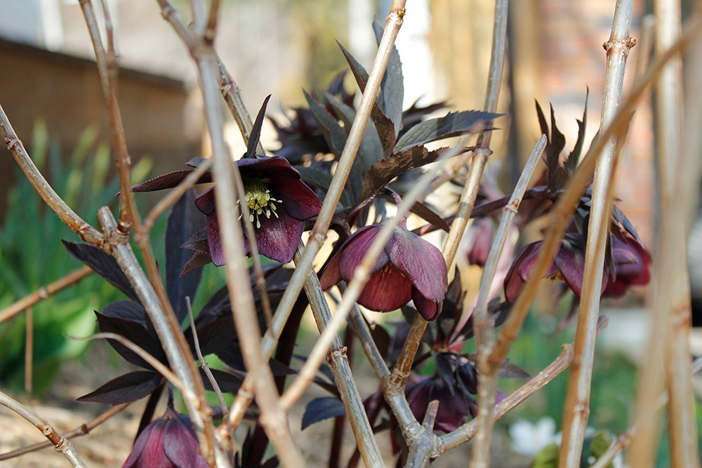 아래 사진은 예쁘게 핀 헬레보어를 찍느라 그 앞에 있던 수국이 찬조 출연으로 나온 것이다. 잘 보면 수국 가지에 마디가 있고, 그 마디에 약하게 싹눈이 보인다. 3월에 가지치기하는 장점은, 이 싹눈을 확인하고 그에 맞게 잘라낼 수 있다는 것이다. 이 싹눈이 있는 마디를 밑에서부터 두 개만 남겨두고 나머지는 잘라내는 방식으로 가지치기를 한다.