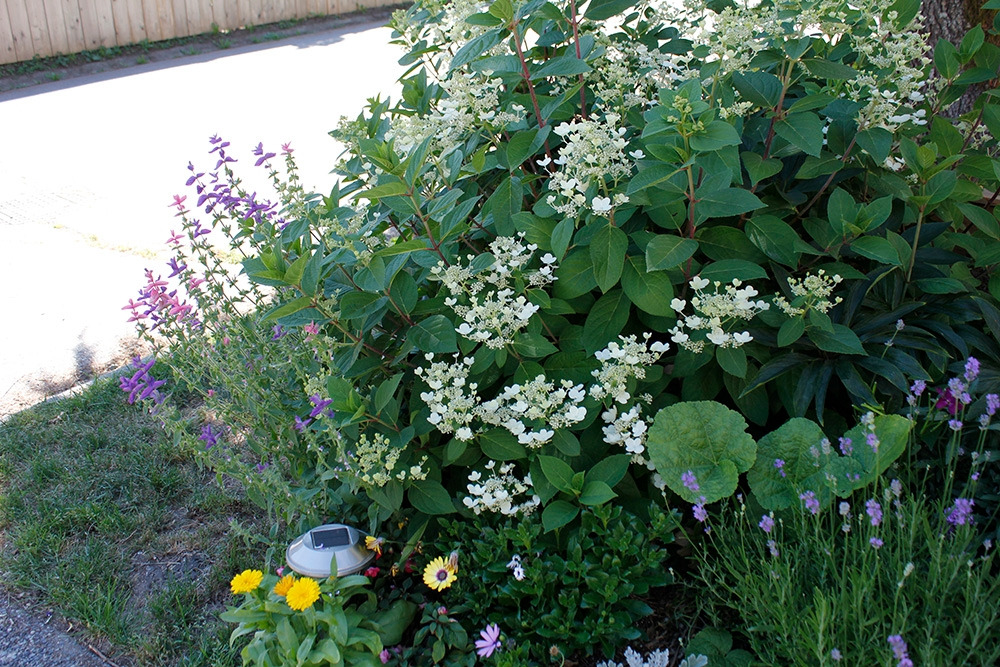 위에서 보았던 보잘것없던 수국이 5월쯤 되니 큼직한 덩어리가 되었다. 짧게 가지치기 한 덕에 동그랗게 예쁜 수형이 잡혔고, 빈자리 없이 빼곡하다.