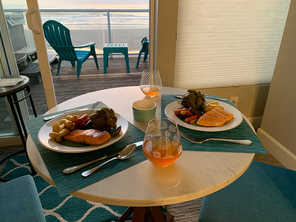 해는 졌지만 아직은 빛이 남아있는 시간, 우리는 완성된 우리의 저녁 식사를 천천히 즐겼다. 집에서 가져온, 우리 집 제작의 샤도네 와인을 곁들이니 더할 나위 없는 바닷가의 식사가 완성되었다.