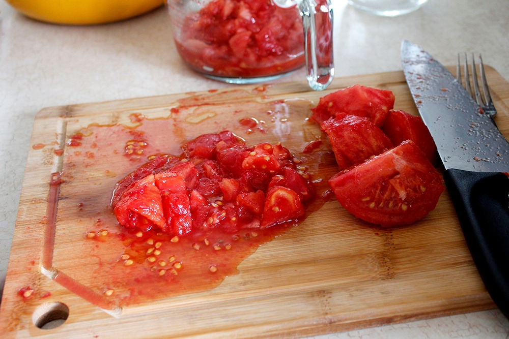 이제 이 토마토를 적당한 크기로 썰어서 모은다. 내가 계산하는 양은 총 10컵이다. 따놓은 토마토가 모자라면 어쩌나 했는데 다행히 딱 맞는 양이 나왔다.