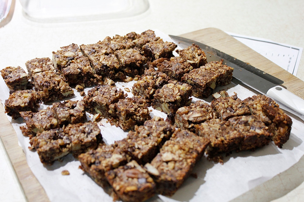 물론 에너지바를 만드는 데에 접착제 역할을 하는 것은 물엿 같은 끈적한 당분이다. 조청이든, 시럽이든 아무튼 그 비슷한 게 들어갈 수밖에 없다. 그래서 이걸 빼고 만드는 것은 쉽지 않다. 하지만 나는 여러 차례의 실험을 통해서 물엿 없이 만드는 법을 만들었다.