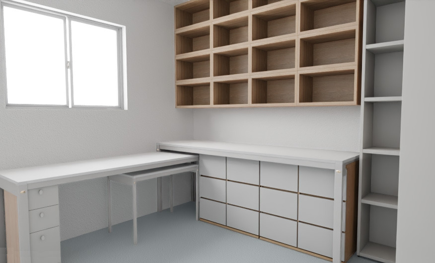 그렇다고 해서 왼쪽의 서랍을 포기하고 싶지는 않았다. 내 손에 닿는 서랍은 반드시 있어야 했다. 결국 우리는 계획을 수정하기로 했다. 오른쪽에 계획했던 작업대 책장의 자리를 다른 곳으로 옮기고 책상은 그 길이를 다 써야 할 거라는 생각이 들었다.