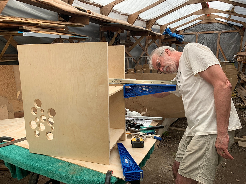 서랍의 형태를 만드는 것도 쉬운 일은 아니었다. 나는 그냥 뚝딱뚝딱 못을 박아서 만들면 될 줄 알았는데, 서랍을 열었을 때, 옆면의 나사못이 보이면 흉하기 때문에 최대한 보이지 않게 작업하느라 특별한 방법을 사용했다. 일명 포켓 스크류, 주머니형 나사못 박기였다.