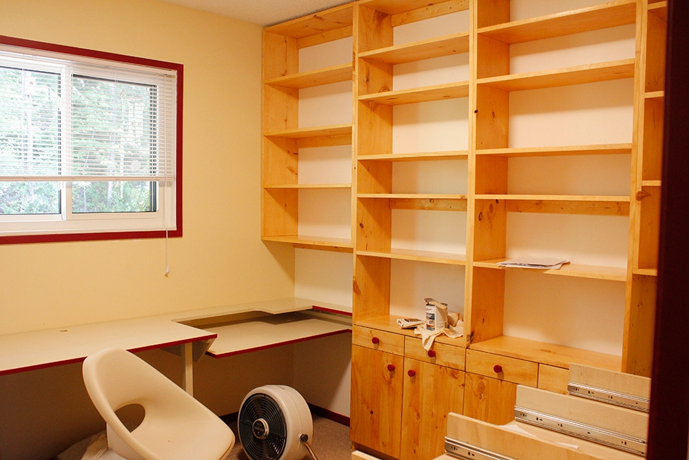 기본적인 나무 커팅 작업은 마당에 있는 보트 작업실에서 이루어졌지만, 원목 책장을 다 완성해서 들고 올라오기에는 너무 무거웠기에, 남편은 맞는 사이즈로 커팅을 해서 가지고 온 후, 방에서 조립을 마쳤다.