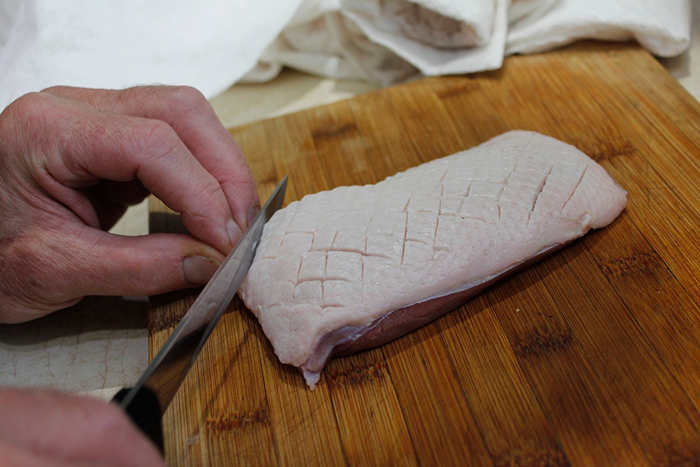 오리 가슴살에 촘촘하게 격자로 칼집을 낸 후, 소금 후추 간 하여서 팬에 앞 뒤로 굽는 방식이다. 특이한 점이라면, 팬을 달구지 않고 차가운 팬에 껍질이 닿도록 놓고 중약불로 서서히 익힌다. 만일 오리가 오그라들면 뭔가를 얹어서 눌러서라도 껍질면이 고루 팬에 닿아 노릇해지게 굽는 것이 중요하다.
