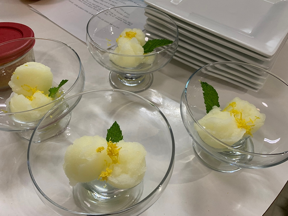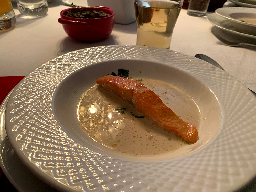 생선 요리는 연어를 살짝 익혀서 소스에 담가 먹었고, 그다음에는 코스가 바뀌기 전에 살짝 입가심하는 상큼한 레몬 소르베(https://brunch.co.kr/@lachouette/234)도 잊지 않았다.