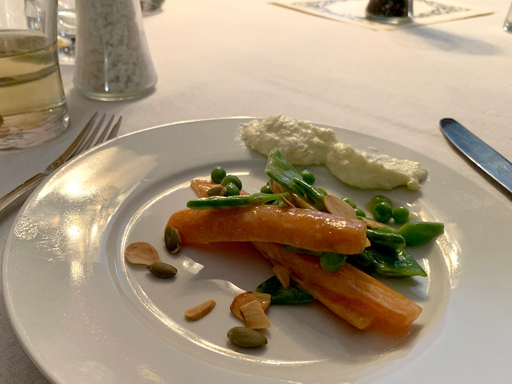 그다음에는 당근과 완두콩에 아몬드 소스를 곁들인 샐러드가 준비되었는데 아주 독특하고 맛있었다.
