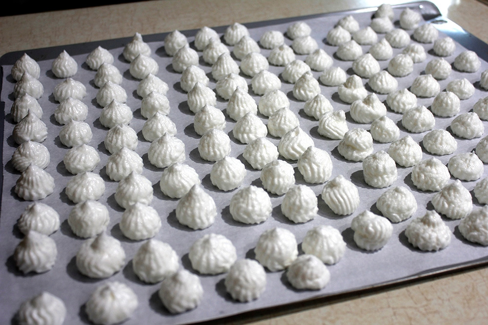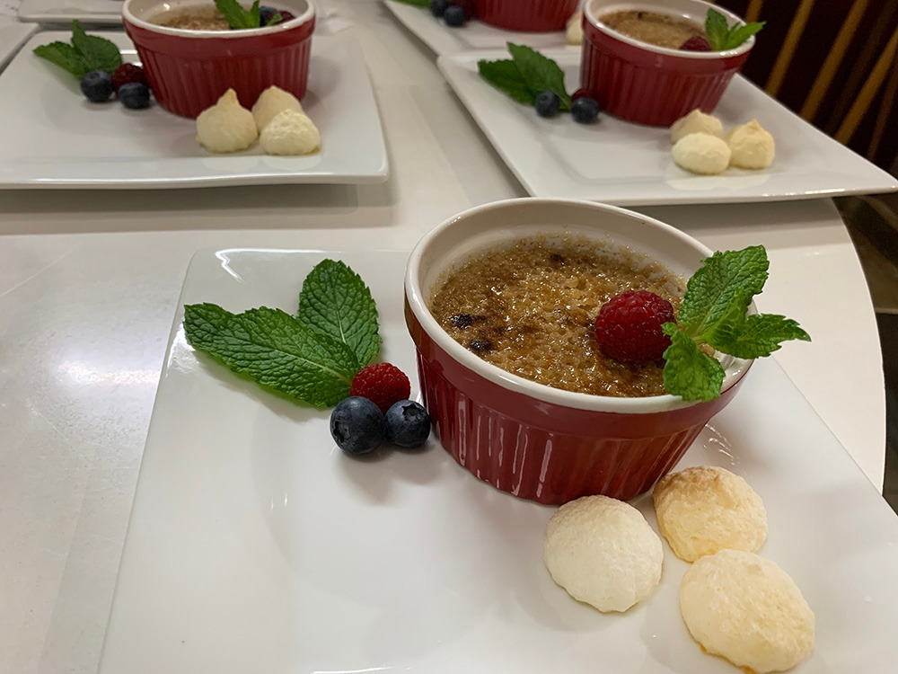 그리고 치즈 코스 거쳐서 마지막에는 크렘 브륄레(crème brûlée: https://brunch.co.kr/@lachouette/252)를 무설탕 머랭쿠키(https://brunch.co.kr/@lachouette/208)와 함께 제공하였다. 크렘 브륄레를 만들 때 달걀노른자가 엄청나게 많이 들어가기 때문에, 남은 달걀흰자는 그런 식으로 소비를 하는 것이 제일 좋은 방법이었고, 그렇게 해서 접시 장식도 근사하게 되니 일석이조였다. 게다가 무설탕 머랭쿠키가 기존 머랭쿠키보다 더 맛있다는 호평도 받았다.