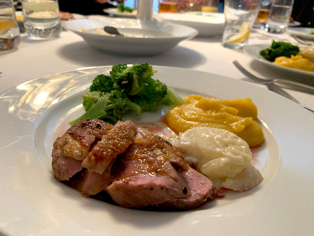 오리고기와 소스는 아주 잘 어우러져서 맛있었다. 곁들임은 감자와 집에서 키운 호박이었다.