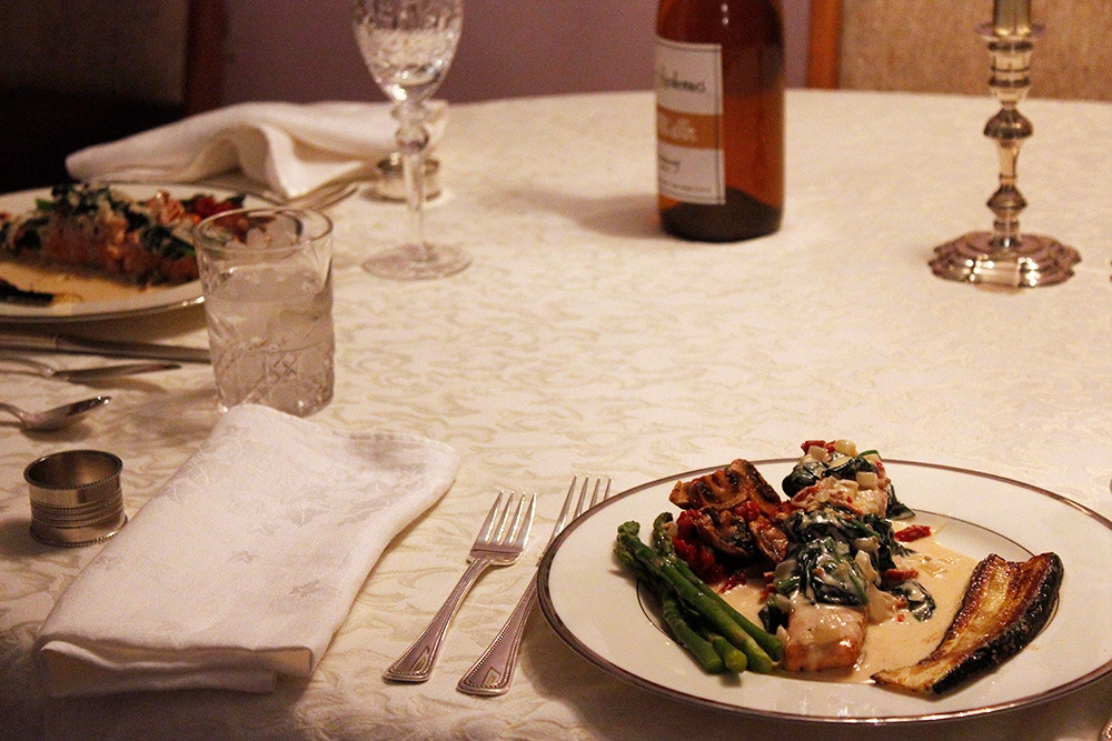 음식은 전적으로 남편이 혼자 차린다. 따라서 제때에 따끈한 식사를 하기 위해서는, 모든 식재료의 전처리 및 준비를 다 해놓고 시작을 하고, 코스의 사이사이에 재빠르게 요리를 마무리해서 상에 올린다. 즉, 잠깐씩 조리 타임이 생길 수밖에 없다.