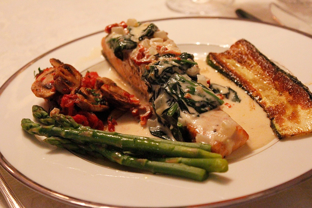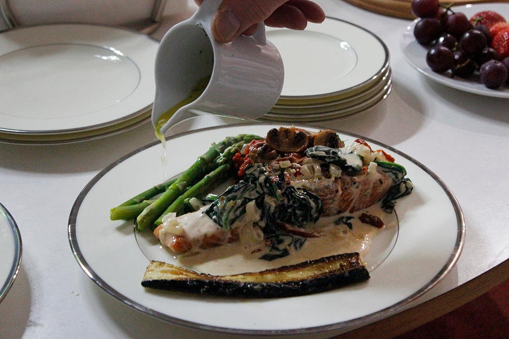 이제 진짜 메인 차례다. 킹새먼 또는 치누크(chinook)라고 불리는 연어를 선택했다. 오일함량이 높고 육즙이 풍부한 고급 연어다. 선드라이드 토마토와 시금치를 넣어서 마늘 크림소스를 만들고, 아스파라거스와 버섯, 구운 호박을 곁들였다.