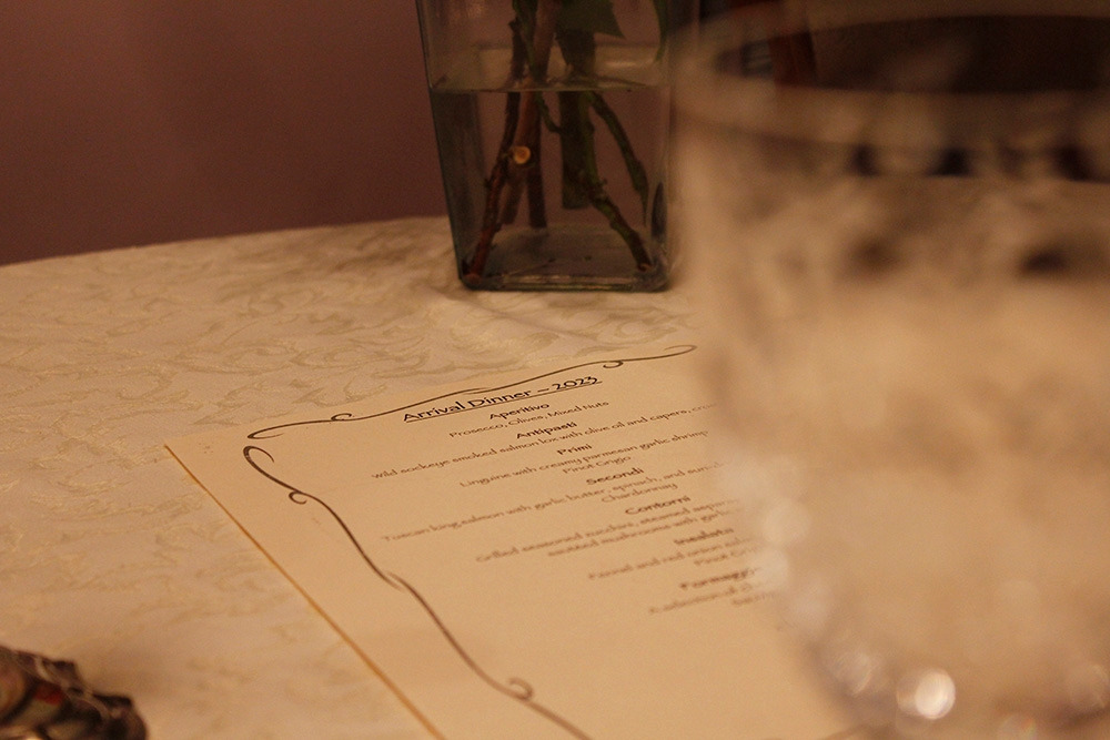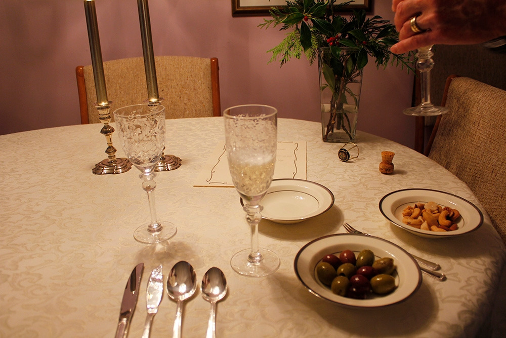 식탁에는 식탁보를 깔고, 촛대를 세웠다. 그리고 평소에 아끼는 접시를 꺼낸다. 크리스마스가 다가오니 마당에 있는 호랑가시나무와 노바스코샤에서 온 전나무 가지로 꽃꽂이를 해서 옆에 두었다. 원래 첫 코스인 아페리티보(Aperitivo)는 식탁이 아닌 곳에 따로 차려서 먹지만, 이번엔 그냥 식탁 한쪽 구석에서 준비했다.