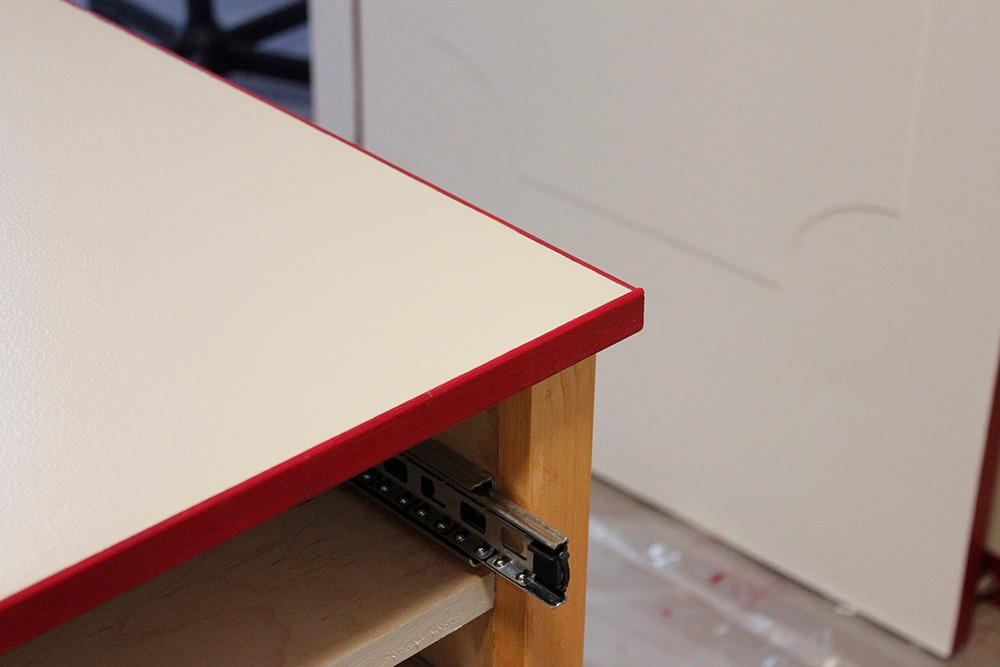 또한 상판에는 책상처럼 붉은색 띠를 둘러 포인트를 주기로 했다. 역시 띠를 따로 페인트칠한 후에 접착제를 이용해서 붙여줬다.