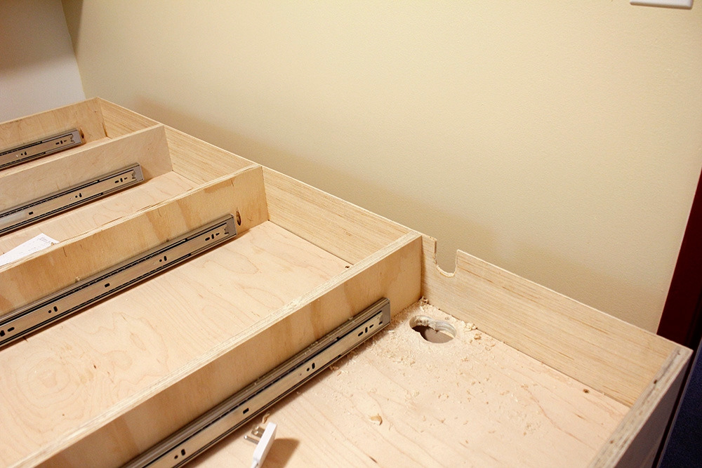 그렇게 한 달가량을 지체한 후 다시 시작된 서랍장에 남편은 박차를 가하기 시작했다. 진작에 사두었던 자동 닫힘 서랍 레일을 설치하고, 거기에 서랍을 끼워 넣었다.