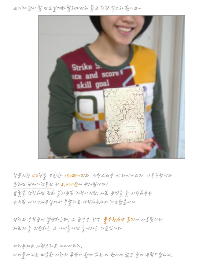 그렇게 다이어리가 탄생되었습니다. 갤러리 하는 제 동생이 사진을 전달받아 제작을 해주었는데, 작게 한 손에 쏙 들어오면서도 작품의 사진을 잘 살려주어서 아주 예쁜 다이어리가 탄생되었습니다.
