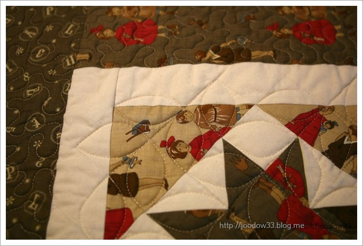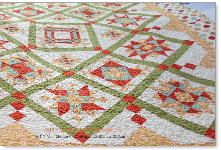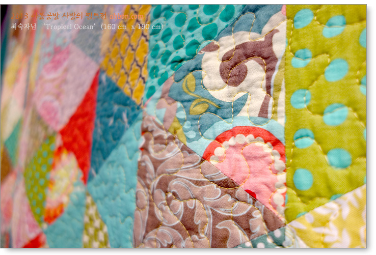 이 작품이 첫번째 위치에 놓인 중요한 이유 중 하나가 바로, 아름다운 퀼팅입니다. 머신퀼트라고 하면 단순작업이라고 쉽게 생각하시는 분들이 많은데, 사실은, 손으로 살살 달래가며 할 수 있는 핸드퀼트보다 훨씬 어려운 작업입니다. 물론 속도는 훨씬 빠르지만, 능숙해지지 않으면 절대 구사할 수 없는 노련함이 필요합니다.