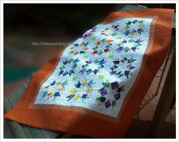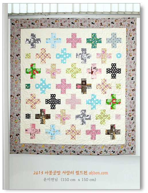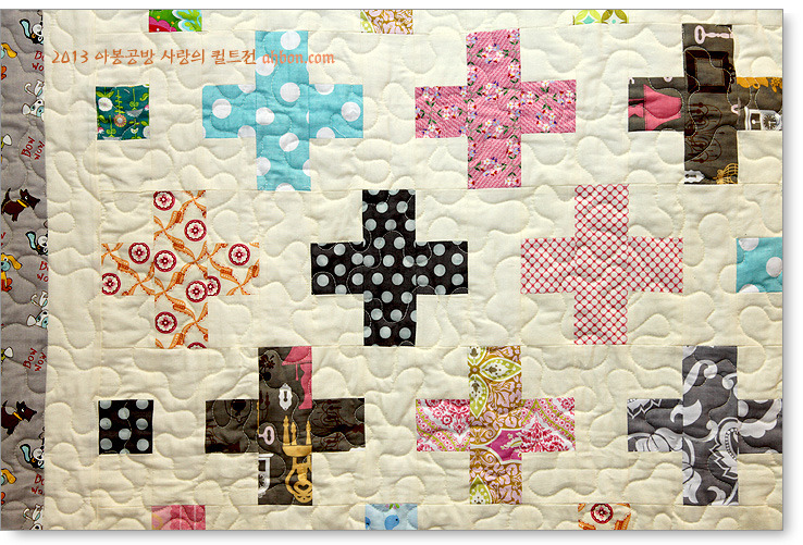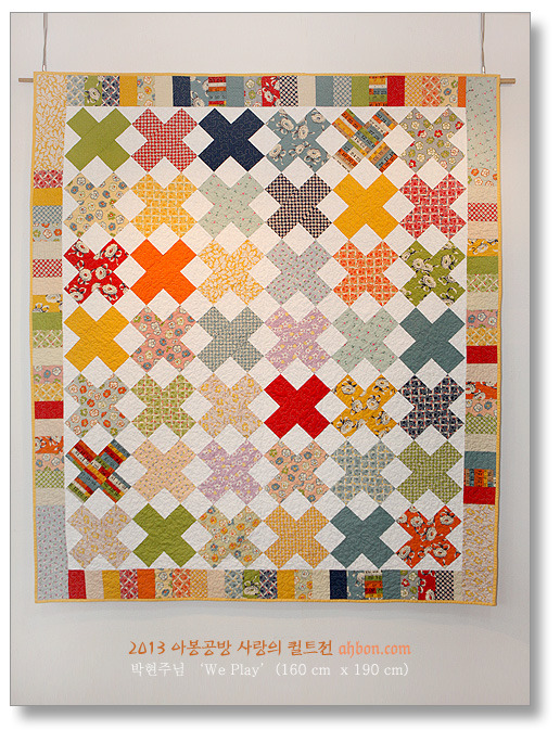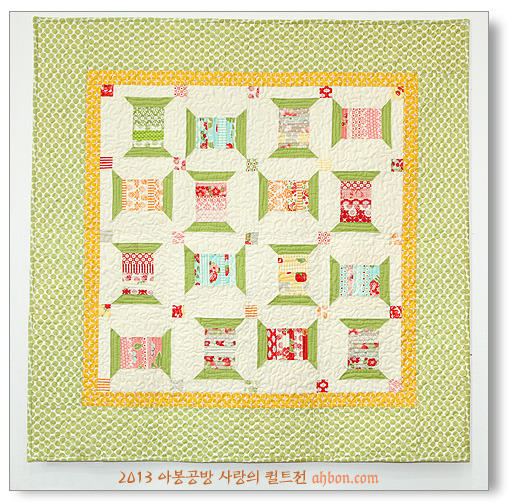 단순한 x자 모양이지만, 색감을 잘 선택해서 생동감 있고, 즐거운 느낌이 드는 작품입니다. 보더에도 다양한 천을 넣어 활기를 더해주었습니다.