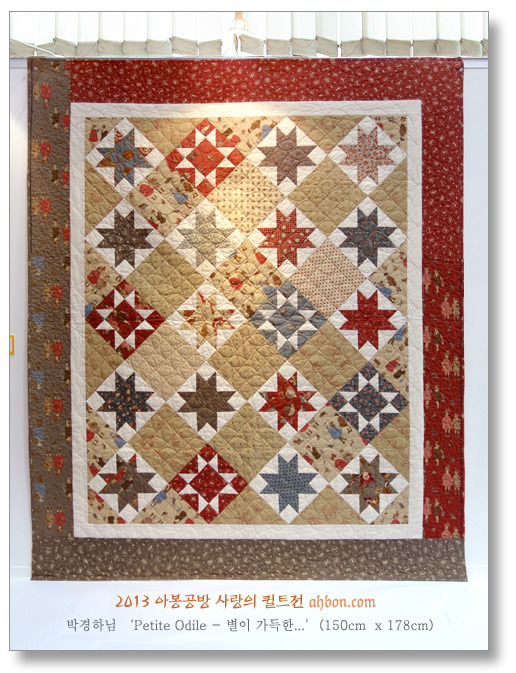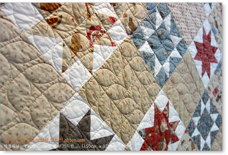 박경하님의 'Petite Odile - 별이 가득한'은 올해 경품퀼트 중 하나입니다. 반짝이는 별들이 예쁜 색상으로 들어있고요, 보더를 각기 다른 천으로 사용해서 더욱 독특하고 아름다운 작품이 되었습니다.