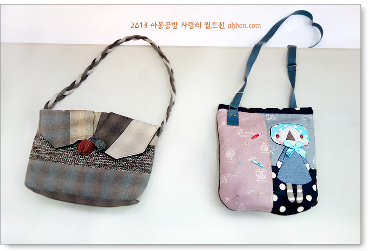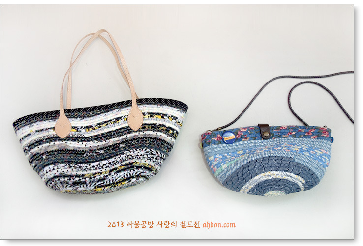 입구가 큼직한 가방도 있고, 이렇게 작은 크로스가방도 있었어요. 재미난 끈을 달거나 레이스로 꾸며서 더욱 색다른 기분이 듭니다. 이 가방들은 모두 안에 빨래줄을 넣고 천으로 감는 기법을 이용한 가방들이예요.
