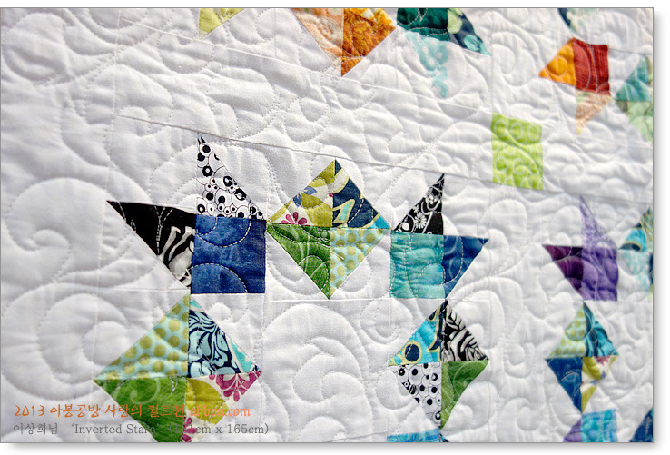 또 하나의 경품퀼트입니다. 그러고보니, 올해의 경품주제가 별인가봅니다. 가만보면, 박경하님과 같은 별 패턴인데, 같은 별인데, 그 별이 흰색이고 그 밖으로 새롭게 별이 뿜어져 나오는 디자인입니다. 그래서 뒤집힌 별이라는 이름이 붙었겠지요? 같은 패턴이지만 완전히 다르게 묘사되는 것, 그게 바로 퀼트의 묘미가 아닐까 생각됩니다.