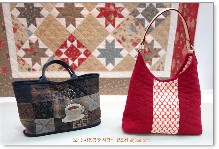 커피 한 잔? 단순할 수 있는 나인패치에 아플리케를 붙여서 독특함을 더해준 가방입니다. 오른쪽에는 빨간 가방, 실용적인 디자인에다가, 그거 아시나요? 빨간 가방을 들면 돈이 들어온대요~
