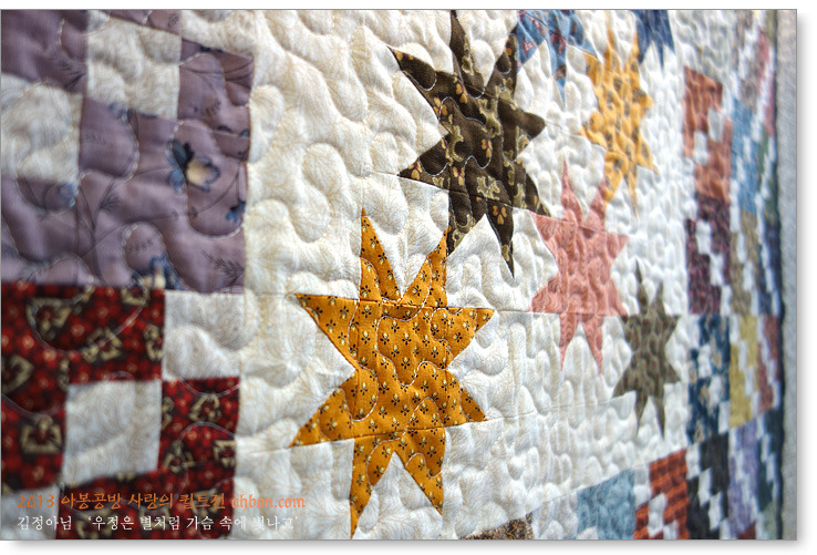 제목도 '우정은 별처럼 가슴 속에 빛나고' 라고 정했는데, 이 이불을 보여드렸더니, "저 별이 나야?"하고 물으며 좋아하시더라구요. 함께 했던 멤버들이 이제는 연로해져서 더이상 우정퀼트를 나누지는 못하고, 한분은 돌아가시기까지 하였지만, 그래도 아직도 소수의 인원이 모이고 있답니다.