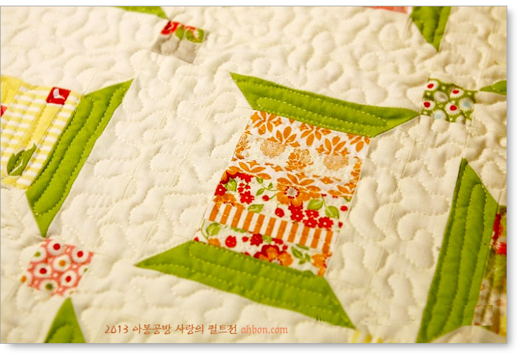 제가 개인적으로 제일 좋아하는 주황색이 많아서 더 좋아하는 걸까요? 주황과 연두, 녹색이 자연스레 어우러져 마치 한장의 천처럼 느껴집니다. 재봉퀼팅도 수준급으로, 전체적으로 참 고르게 잘 누볐습니다.