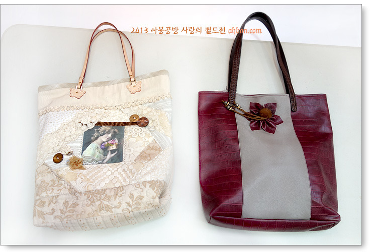 크레이지 기법으로 만들어진 왼쪽 가방은 가운데에 예쁜 소녀를 넣고 레이스를 붙여서 낭만적인 분위기를 내었고요, 사이즈도 제법 큼직해서 사용하기 편리한 가방이죠.