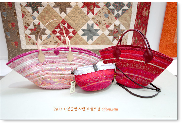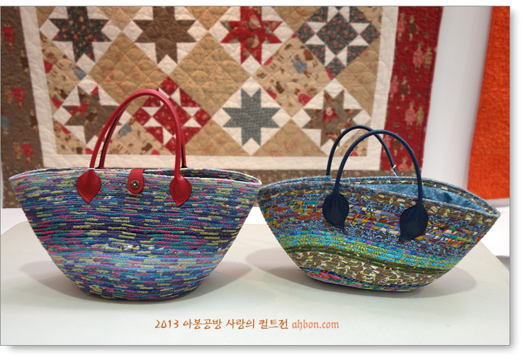 오른쪽에는 새 원단에 적절한 패치를 해서, 봄 가방으로 딱 맞네요. 왼쪽은, 올해 인기 아이템이었던 바구니 스타일 가방이예요. 노끈에 천을 감아서 연결하는 특별한 방식으로 제작해서 인기를 끌었답니다.