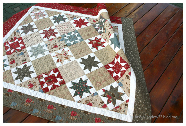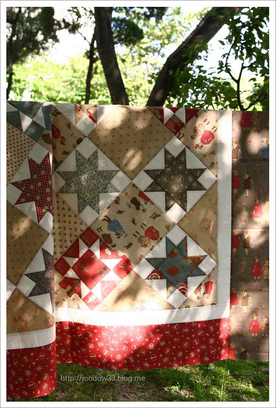 제꺼네요. 사실은 저 혼자 만든 작품이 아니라, 우정퀼트랍니다. 캐나다에 처음 갔을때 함께 바느질한 멤버들과 함께 나눈 블럭이예요. 매월 만날때마다 같은 모양의 다른 블럭들을 만들어 가지고 와서 서로 교환을 했었어요. 대부분이 할머니였던 8명의 멤버를 그리워하는 마음으로 우정의 별을 8개 가운데에 넣었습니다. 잘 보면 별들이 서로 손을 잡고 있어요.