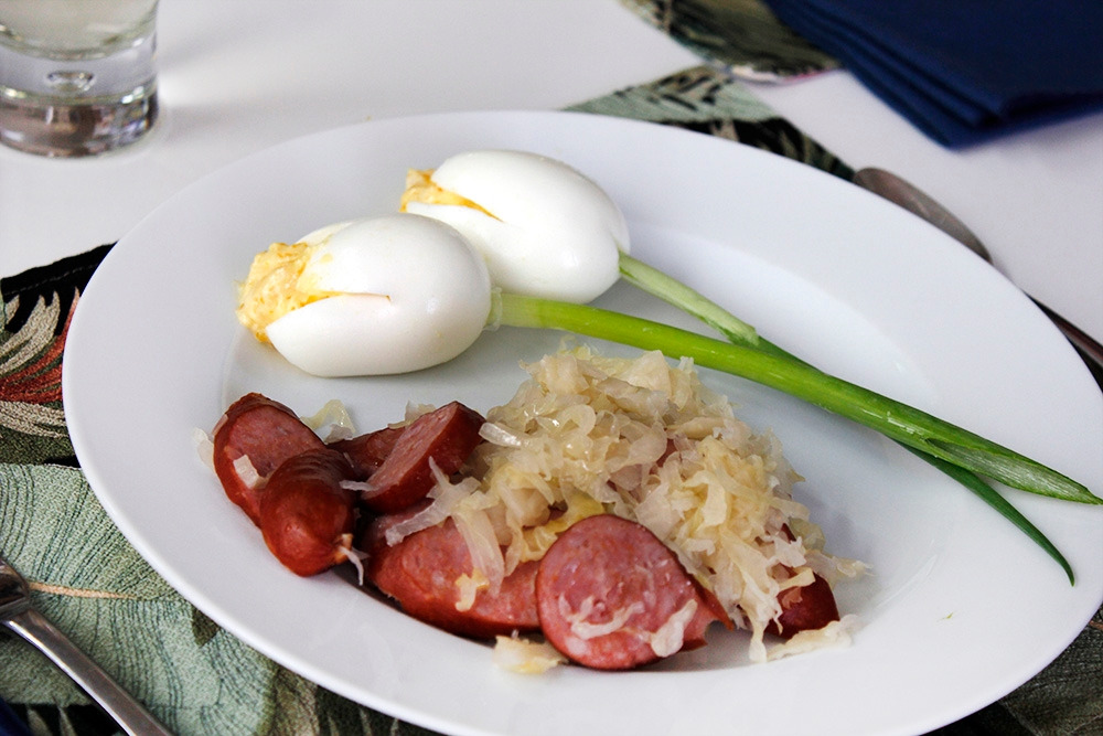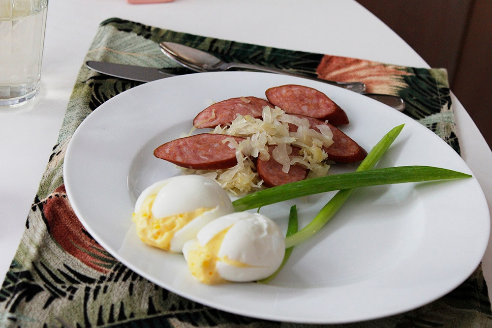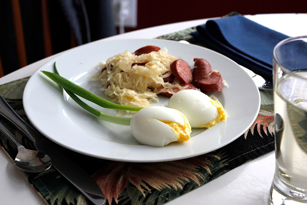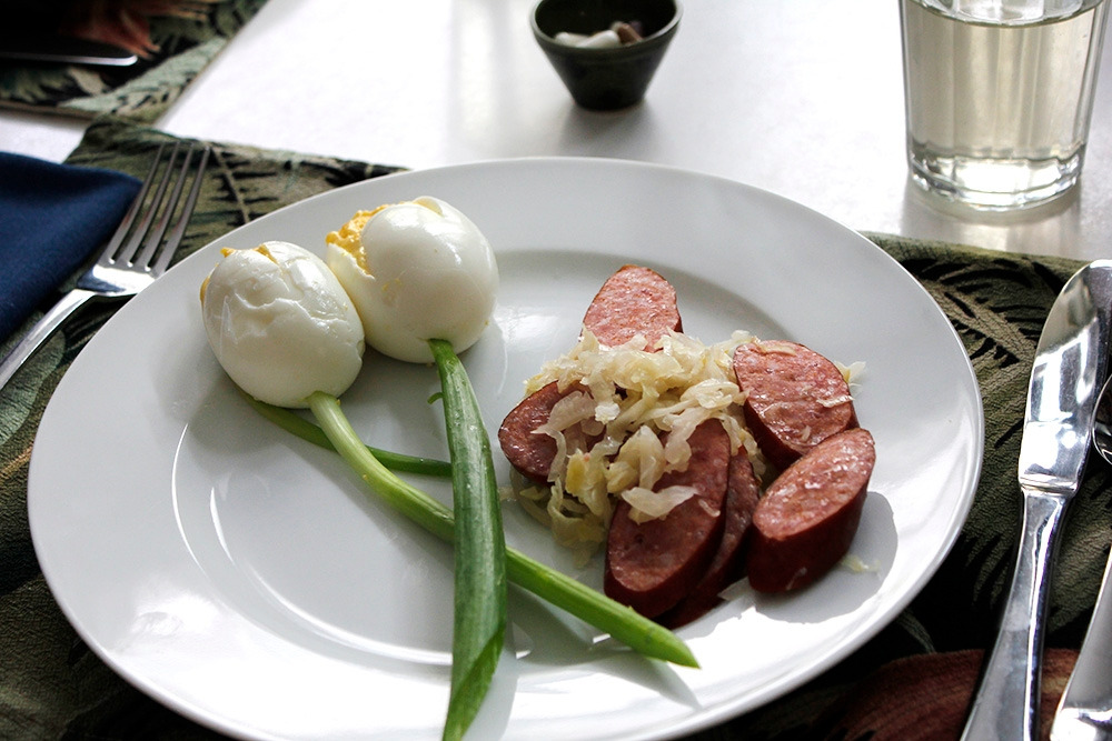 이것만으로는 식사가 부족할 테니, 남편이 소시지와 사워크로우트를 데웠다. 나는 파를 모양 있게 잘라서 달걀에 끼웠다.