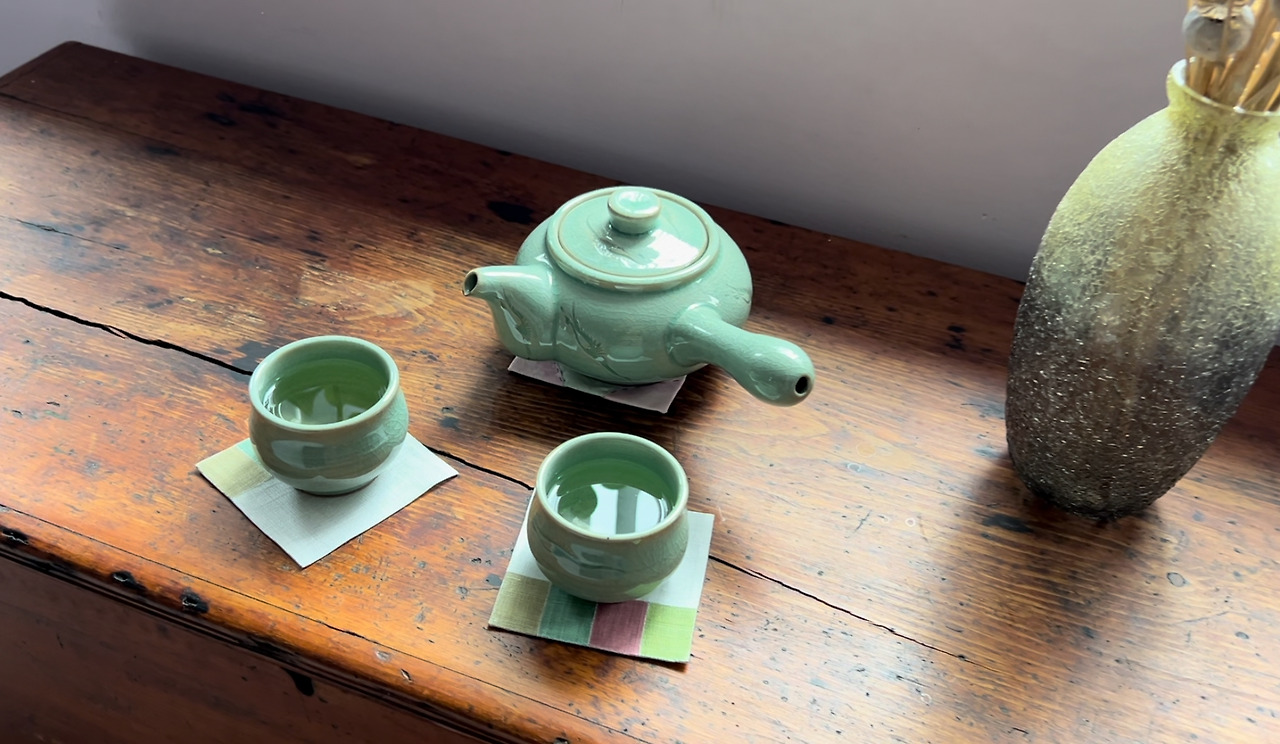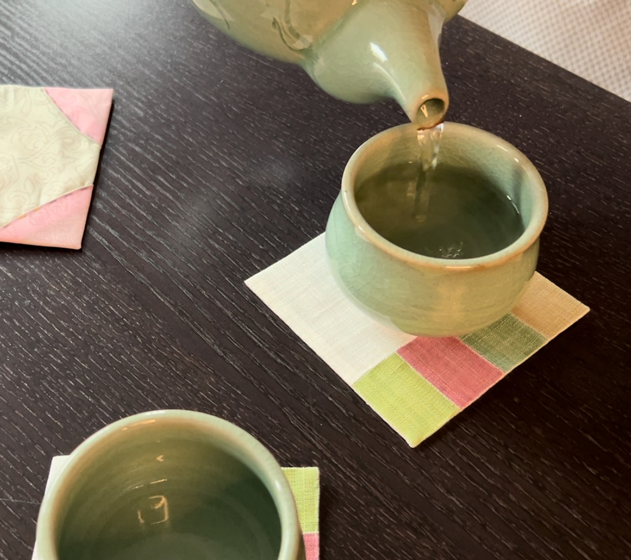 차를 우릴 때는 팔팔 끓는 물을 붓는 게 아니라 살짝 식힌 물을 넣는 게 좋으므로, 물을 다른 용기에 담아서 다시 부어주면 온도를 쉽게 낮출 수 있다. 우리는 결혼할 때 남편이 선물한 청자 다기 세트가 있어서 이왕이면 거기에 분위기를 내며 마셨다. 사실 나는 다도는 잘 모른다.
