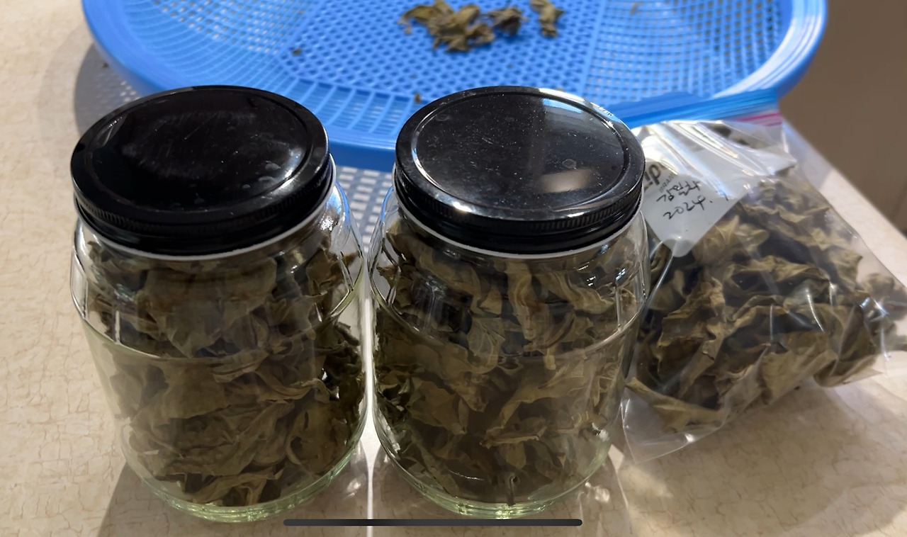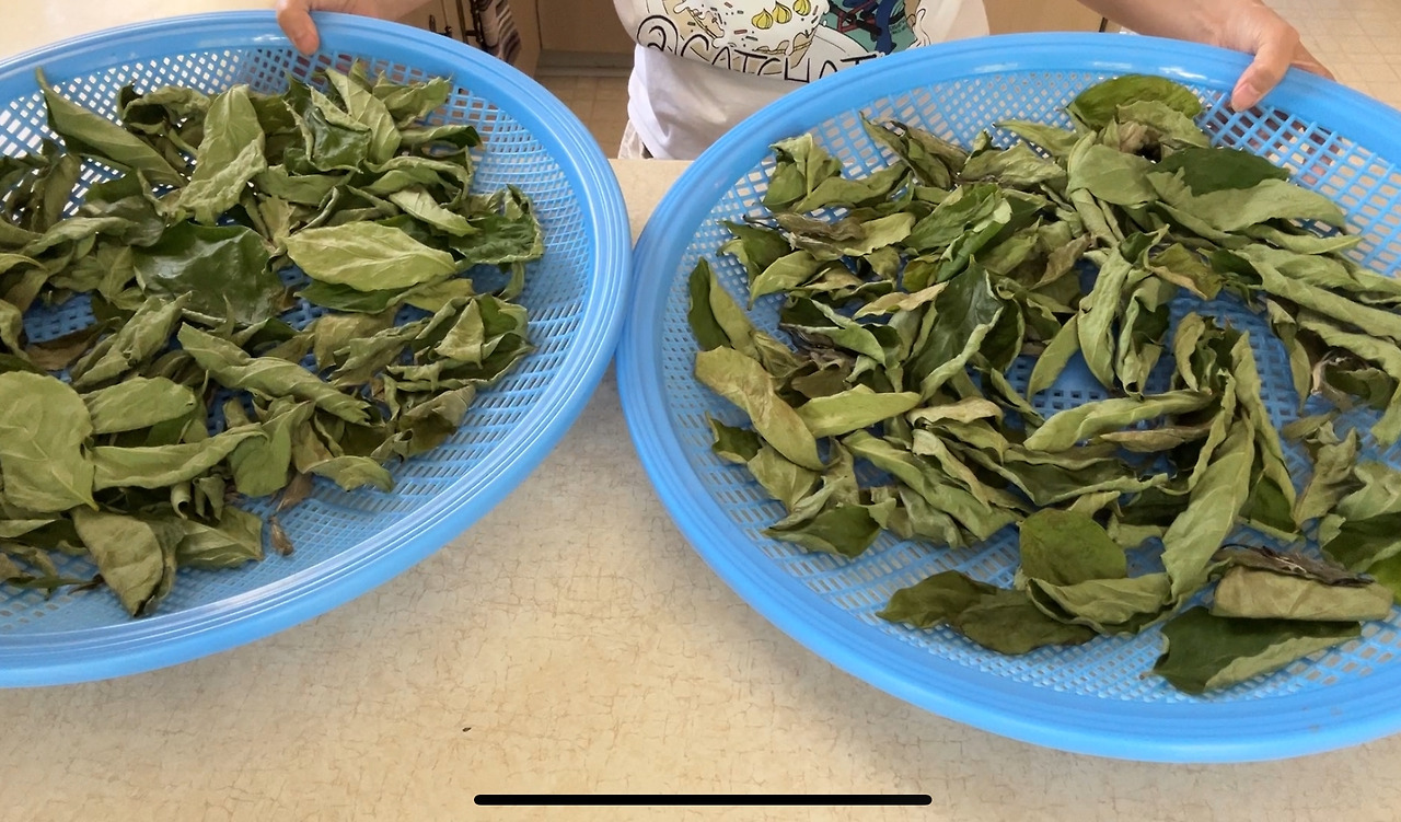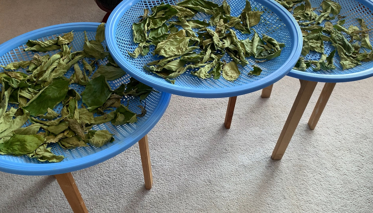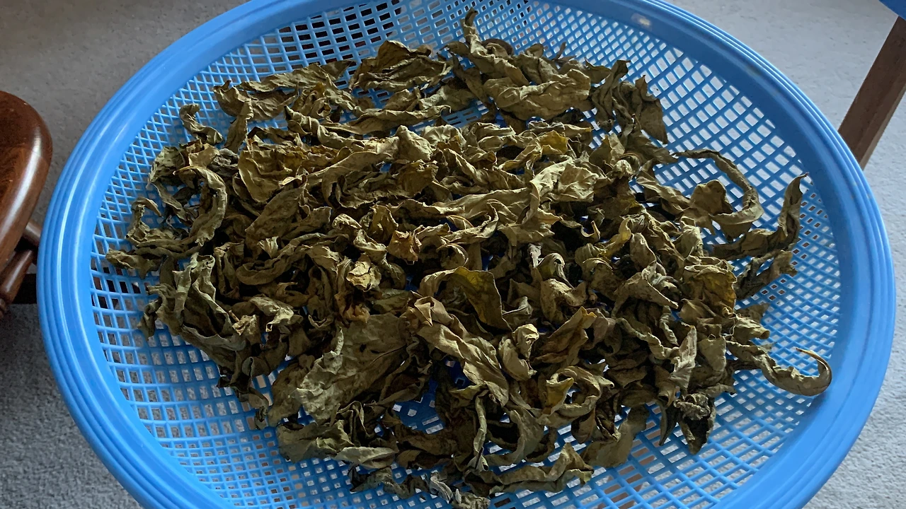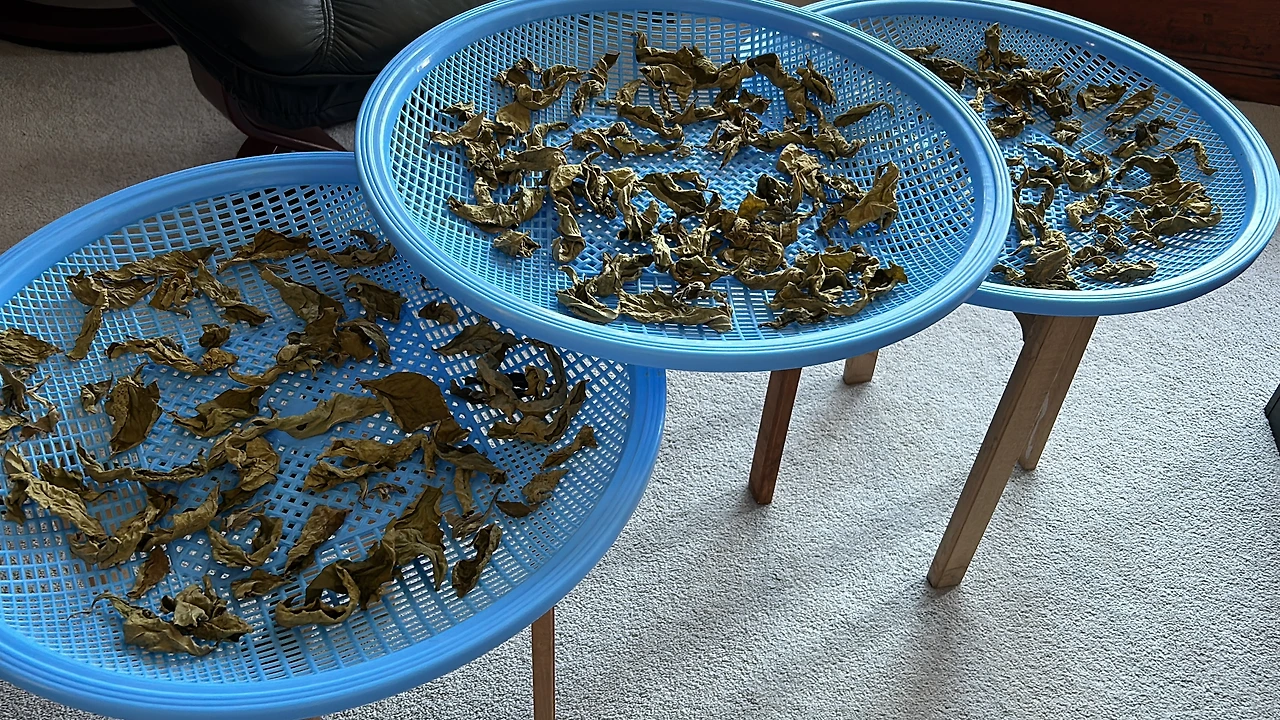 소쿠리에서 물기를 충분히 뺀 후, 넓은 채반에 펼쳐서 말리기 시작했다. 이렇게 이삼일 정도 말리는데, 아무래도 잎들이 조금씩 겹쳐있다 보니, 나는 오며 가며 한 번씩 뒤집어 줬다. 여러 장이 겹쳐 있는 곳은 빨리 마르지 않으면 혹시라도 상하지 않을까 걱정이 되기도 했는데, 그런 일은 생기지 않았다.