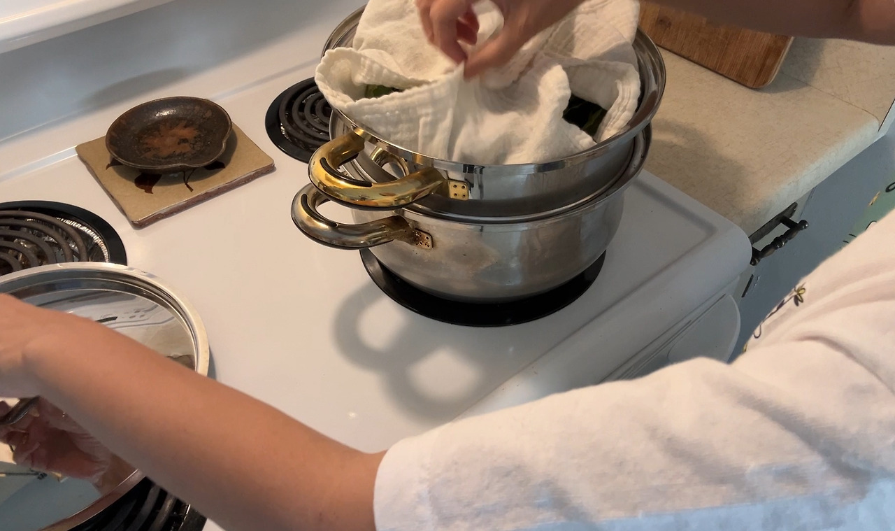 김 오른 냄비에 찜기를 넣어주는데, 위쪽도 면포로 덮어서 뚜껑에 맺힌 물방울이 잎에 직접 떨어지지 않게 해 준다. 오래 찔 필요도 없다 딱 1분 30초간 찐다.