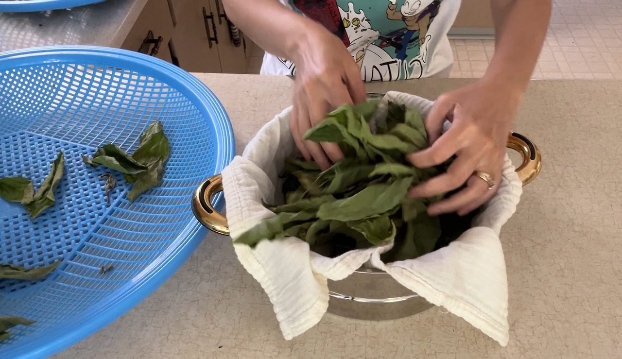 5. 찜기에 면포를 깔고 잎을 넣은 후, 1분 30초 정도 찐다.