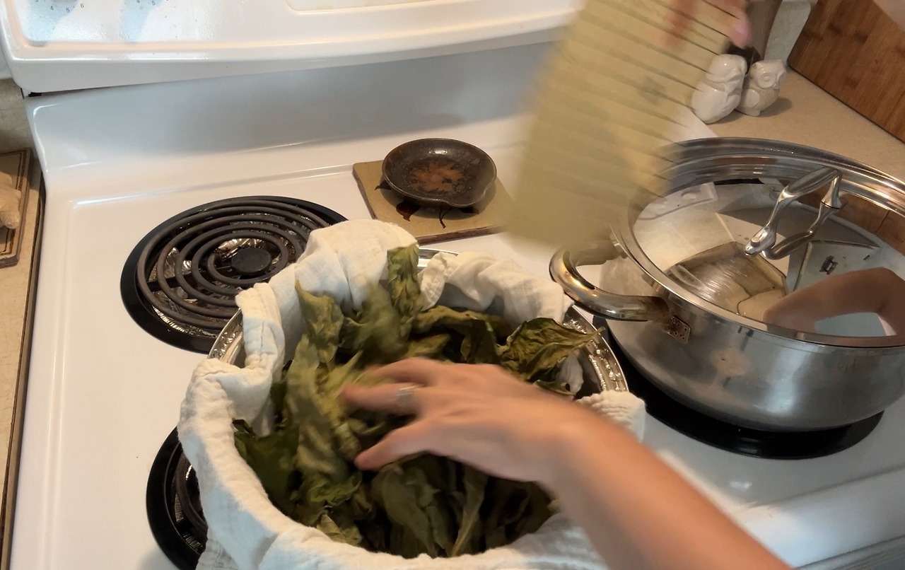 이제 냄비에 물을 올리고, 찜기에 감잎을 담을 차례다. 감잎을 바로 찜기에 담는 것이 아니라, 면포를 먼저 깔아준다. 감잎이 직접 냄비에 닿으면 너무 뜨거워질 수 있고, 물에 닿으면 찌는 것이 아니라 삶는 것 같이 될 수 있으므로 이렇게 해주는 것이라 생각된다.