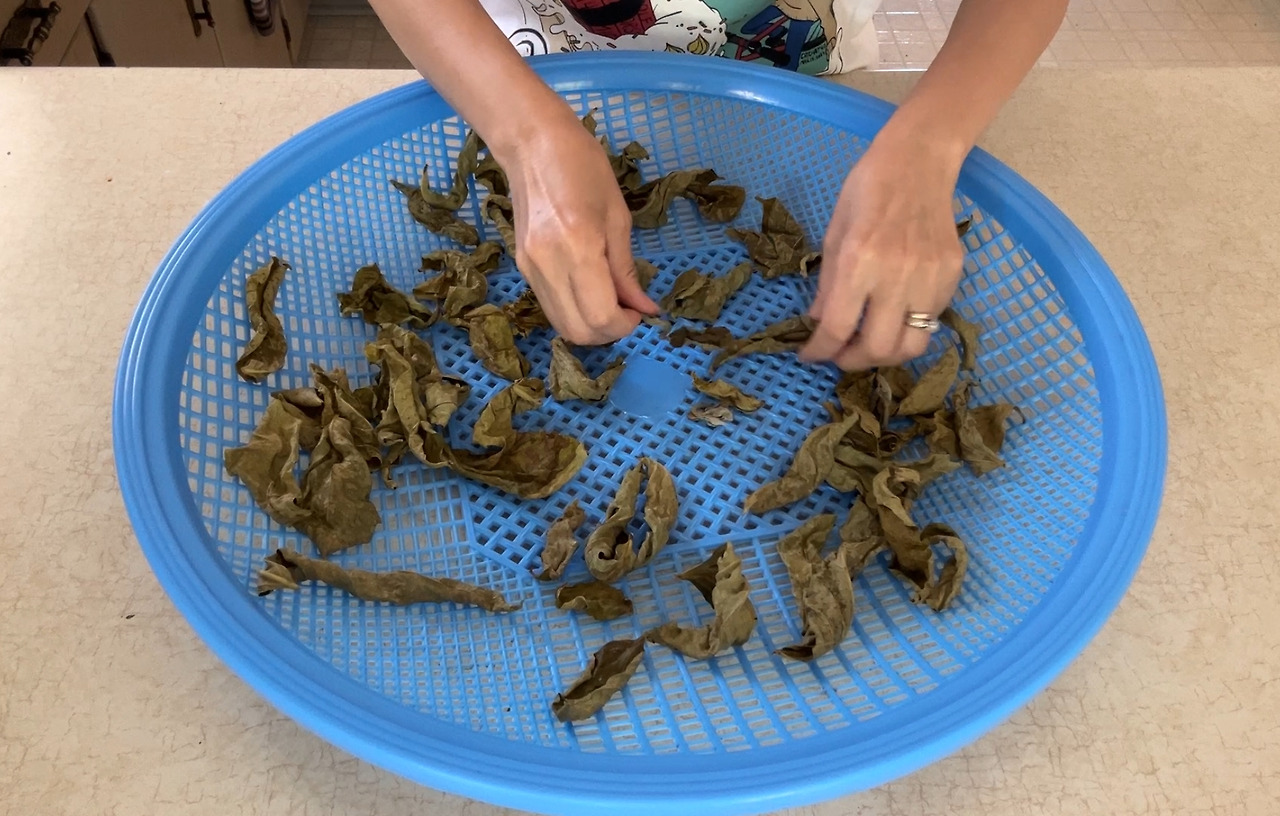 다 쪄진 감잎은 서로 겹친 잎들을 분리해 주고 채반에 널어서 다시 말린다.