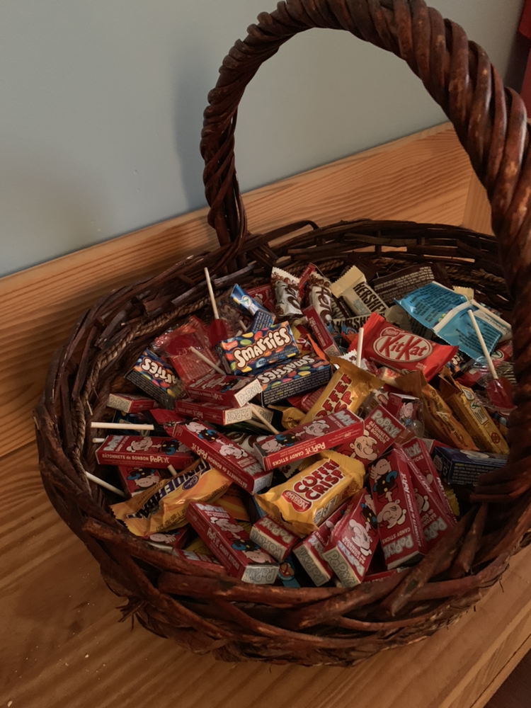 우리는 사탕봉지를 종류별로 열어서 바구니에 그득하게 담았다. 물론 그러고도 훨씬 더 많은 양이 남았지만, 애들 주고 나서 더 채워 넣을 요량으로 준비했다.