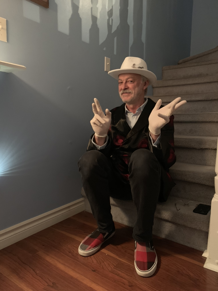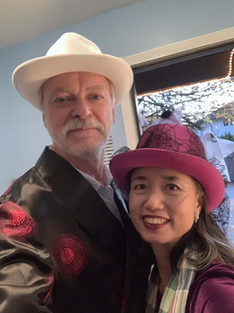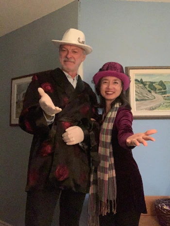 그리고 나는 보라색 모자에 맞춰서 보라색 벨벳 블라우스를 입고, 보라색이 들어간 스카프를 둘렀다. 음... 뭔가 아쉬우니 화장을 좀 하고, 입술도 보라색으로 칠하고, 얼굴과 목에 흉터를 그려 넣었다. 남편은 흰색 재킷이 있으면 좋겠지만 없으니 아쉬운 대로 실크가운을 걸치고, 하얀 모자에 어울리게 하얀 장갑을 착용했다. 우리가 같이 서니 나름 그럴듯했다.