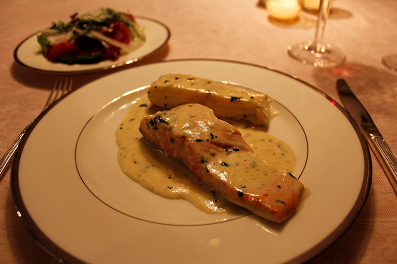연어와 대광어를 크림소스에 익혀서 부드럽게 먹는 요리였고, 화이트 와인을 곁들였다. 샐러드도 색을 맞춰 적색 상추와 푸른 야채를 같이 사용했다. 생선은 입에서 살살 녹았다.