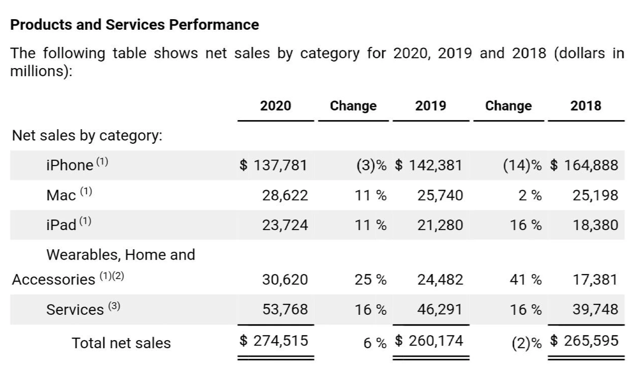 여기서 잊지 말아야 할 사실은 애플의 상당한 태블릿 시장 점유율(2020년 기준 약 30%)과 매 분기마다 증가하는 매출액(2019년 대비 11% 증가)입니다. iPad 키보드, 펜슬과 같은 액세서리를 고려하면 사실상 판매대수보다 정가가 높아진 것이 아니냐라는 얘기를 할 수도 있겠지만, 하단의 표와 같이 애플은 iPad와 iPad의 액세서리를 구분합니다. 이것은 iPad는 하드웨어와 소프트웨어 업데이트를 거듭할수록 대중의 혼란스러움과는 반대로 더욱더 성공적인 시장 반응을 보이고 있다는 이야기입니다. Mac 또한 iPad 못지않게 뛰어난 성장을 보이고 있는 것을 하단 대조표에서 확인할 수 있는데요. 저는 문득 애플은 Mac과 iPad 간 경쟁을 유도하는 것이 아니라 Mac - iPad 패키지 판매에 무게중심을 두는 것이 아닌가 했습니다.
