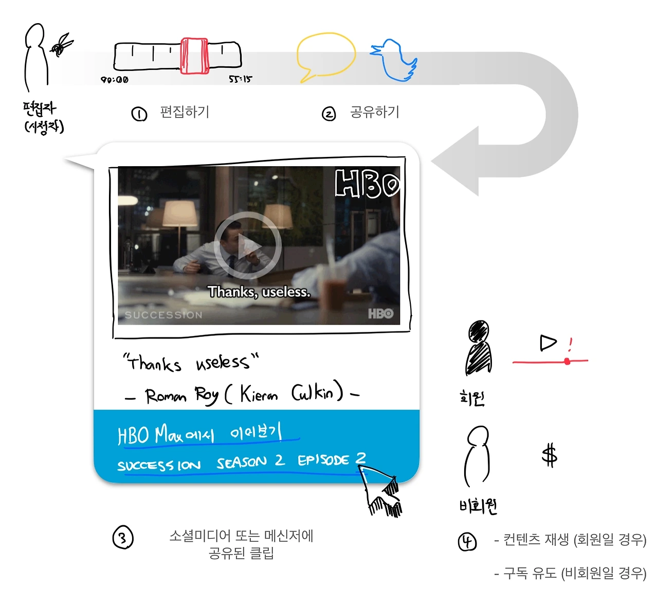 여기에 덤으로 가볍게 자막을 넣을 수 있으면 좋겠죠. 완성된 편집물은 스크린샷, GIF(움짤), 또는 클립으로 내보내 공유하게 되는 형태가 아닐까 싶습니다. 서비스 구독자의 경우, 영상 링크를 클릭하면 스트리밍 서비스 페이지로 이동하여 본 콘텐츠를 바로 시청할 수 있는 편의성을 제공하고, 고객이 아니라면 신규회원을 유입하는 경로가 됩니다. 물론, 수많은 테스팅을 거치고, 구현중 생기는 문제들이 많겠죠. 하지만, YouTube Clips라는 좋은 벤치마킹이 있는 상황에서 스트리밍 서비스를 제공하는 '빅컴퍼니'들이 충분히 도입할 수 있는 피쳐라고 생각합니다.